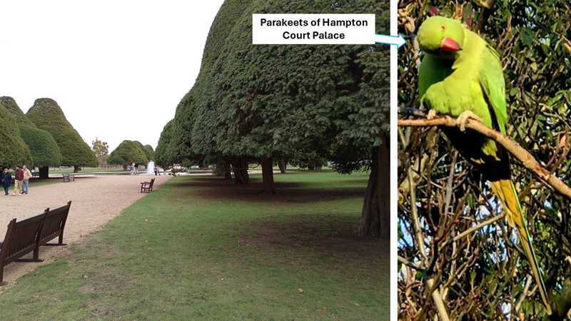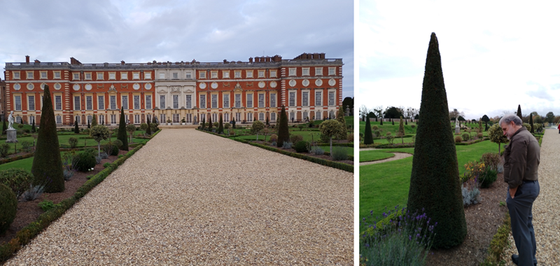 We strolled through the Great Fountain Garden looking at their huge, trimmed yew trees. Bright green parakeets were flying around us.