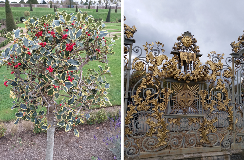 A neatly trimmed variegated holly bush/tree, and at the end of the garden is a fence with very elaborate and gilded decor.