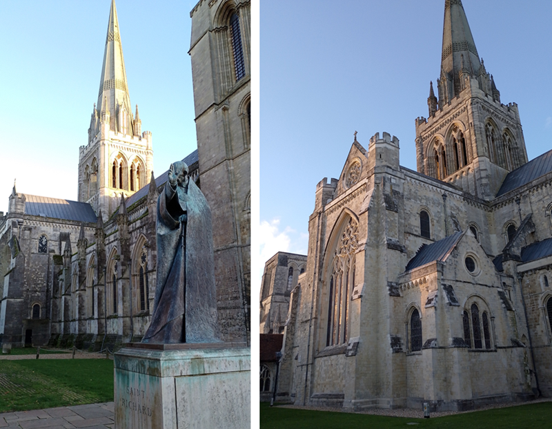 The statue of Saint Richard stands outside the cathedral making the sign of a holy blessing.
