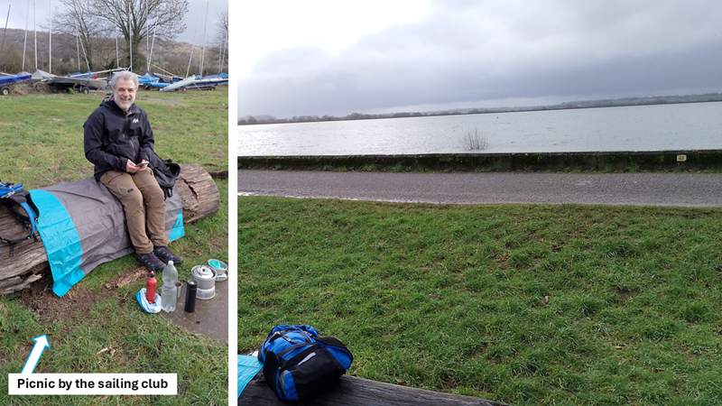 We found a log to sit on next to the sailing club. A sandwich and a cup