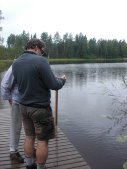 to Tuula's cabin. Here Eija and Rob are consulting the GPS. And after some wobbling we all managed to get into our kayaks from the jetty - without falling in the water.