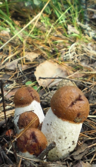 We spotted nice red-white "Fluesopp" (Norwegian and "fly amanita" in English); a white-brown one we couldn't name;