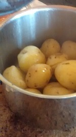 The first dinner included home grown potatoes and salad. Self-picked lingonberries made into jam. Self-picked chanterelle mushrooms made into sauce.