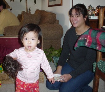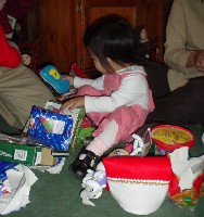 Middle: Mikayla opening her presents - Yeah! A 'cell phone'.